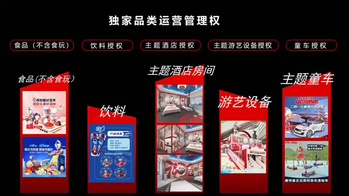 独家品类运营管理权:食品(不含食玩)、饮料授权、主题酒店授权、主题游艺设备授权、童车授权
