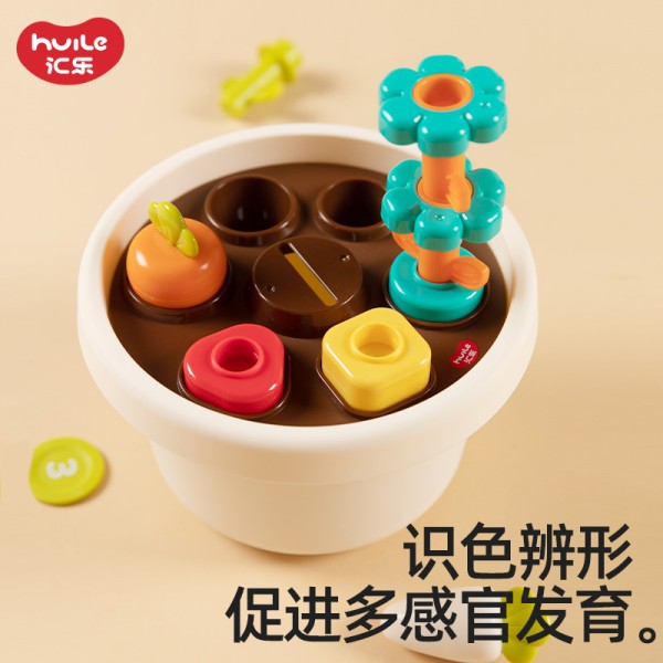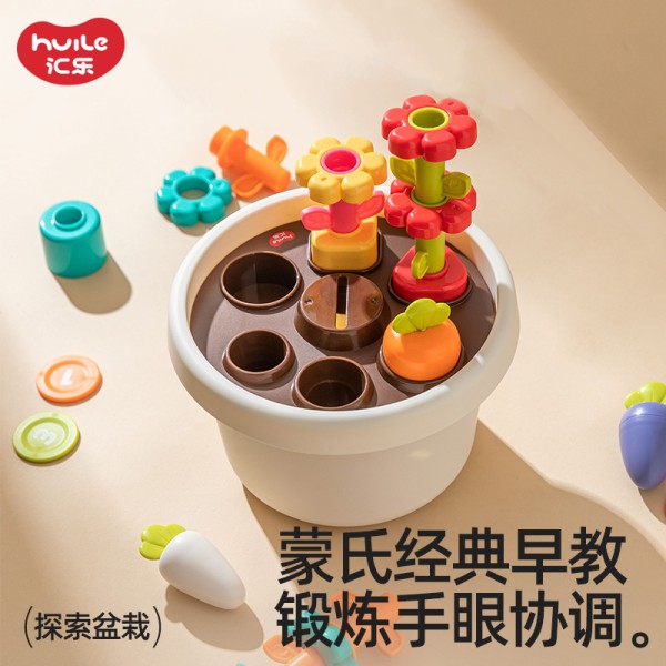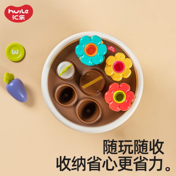 1、这款产品以盆栽为主题,用拔萝卜,种植花朵、塞硬币来训练宝宝的双手协调,