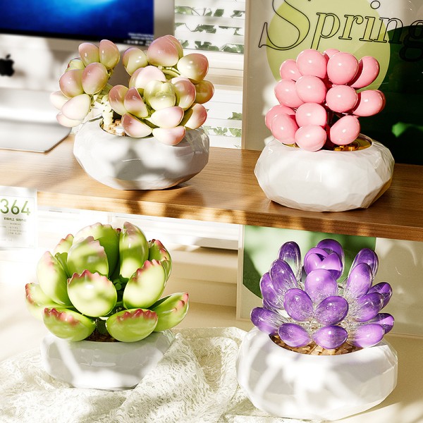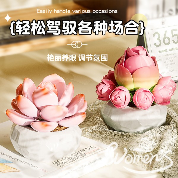 多肉系列目前共有10款产品,熊童子、桃蛋、玉露、橙梦露、淡雪、乙女心、山地玫瑰、紫乐、冰玉和钱串,创意盆栽可自由组合造景,仿真度高,肉瓣颜色渐变,拟真细节,形态还原,解压拼搭让你打造桌面绿洲。