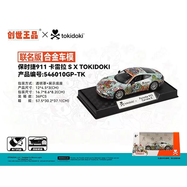 漳州市华达威合金塑胶玩具有限公司,创世王品品牌5寸Tokidoki联名保时捷911卡雷拉S合金车模,经过保时捷原厂正版授权,采用锌合金+ABS塑料制成,左右车门均可开启,车身图案是Tokidoki品牌的标志性元素,实现潮流于汽车模型的经典碰撞。