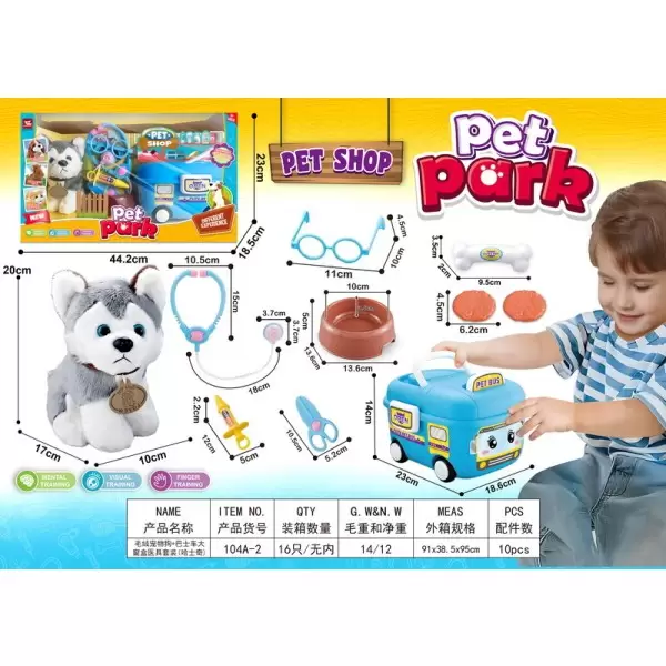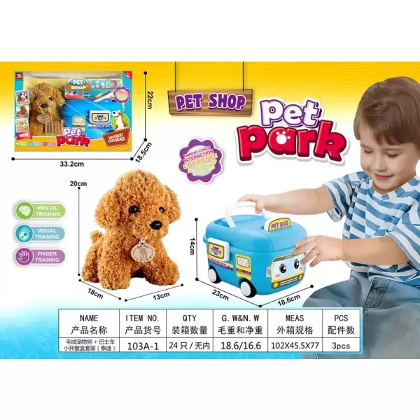 货号103A-1系列,益智无功能毛绒宠物狗+巴士车 小开窗盒套装 (泰迪)产品具备:En71/10P/En62115/CD/ASTM/HR4040/ROHS/CE证书,欢迎咨询订货