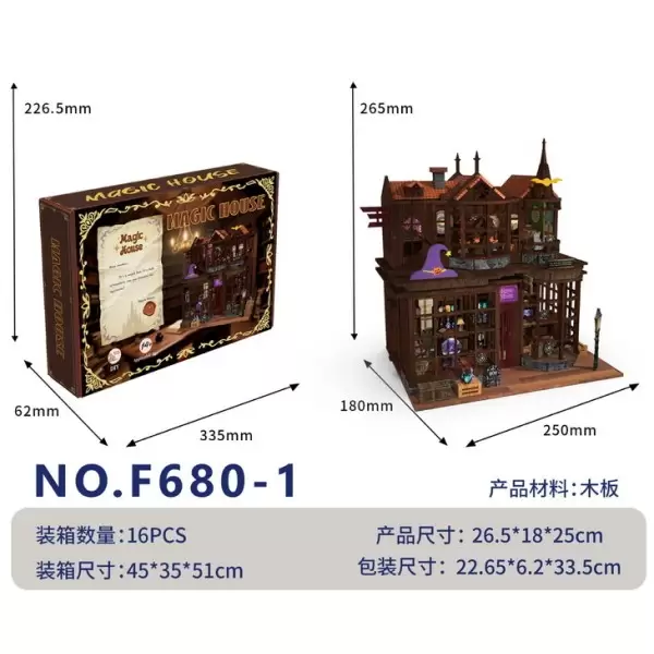 货号F680-1,英文新款益智3D魔法屋木制拼装 带灯光,欢迎咨询订货