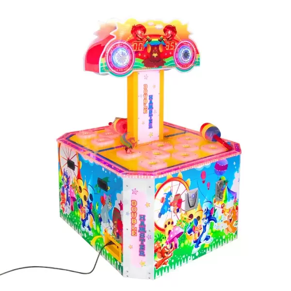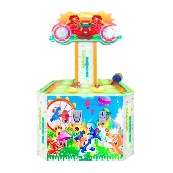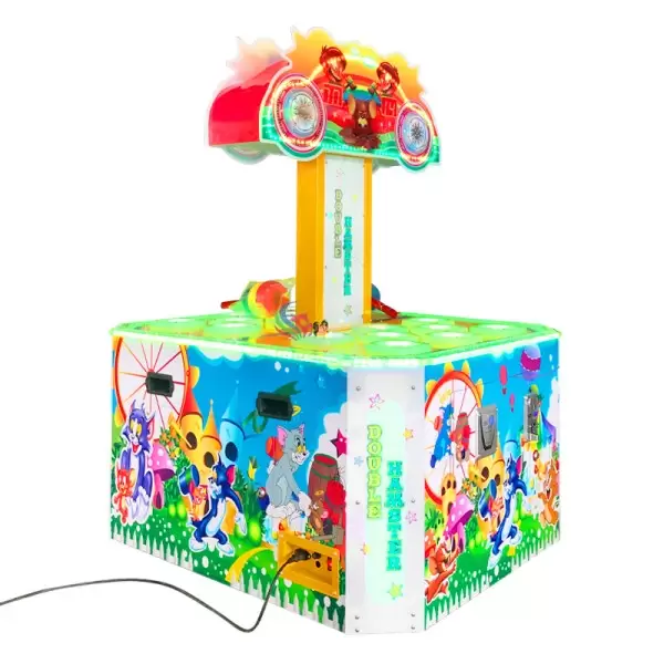 这款打地鼠游戏机外观造型十分吸睛,整体呈立方体结构,机身表面覆盖着色彩斑斓的卡通图案,诸如可爱的小动物、缤纷的花草等元素,充满童趣,能够迅速吸引儿童和亲子家庭的目光 。顶部设置了一个醒目的装饰结构,带有卡通形象和亮眼的灯光,进一步增强了视觉吸引力,即使在较远的地方也能被轻松注意到。