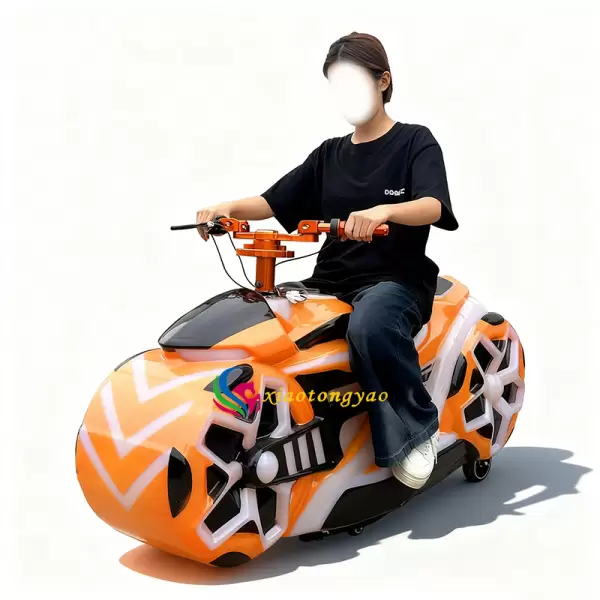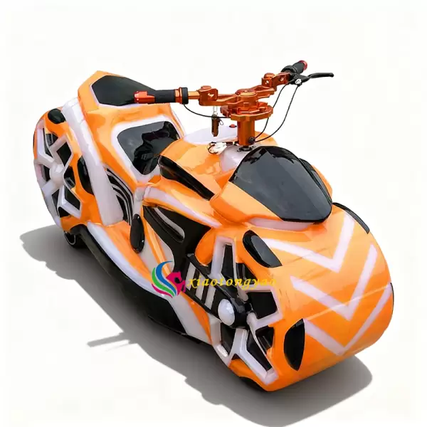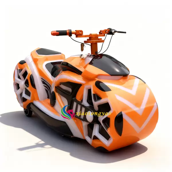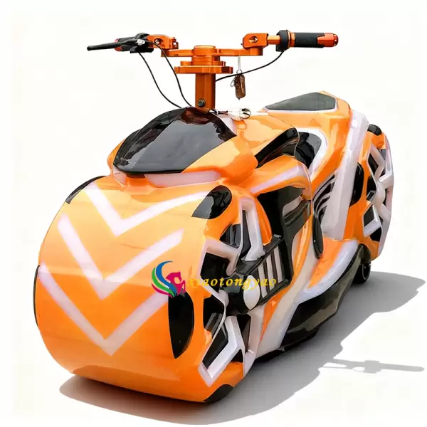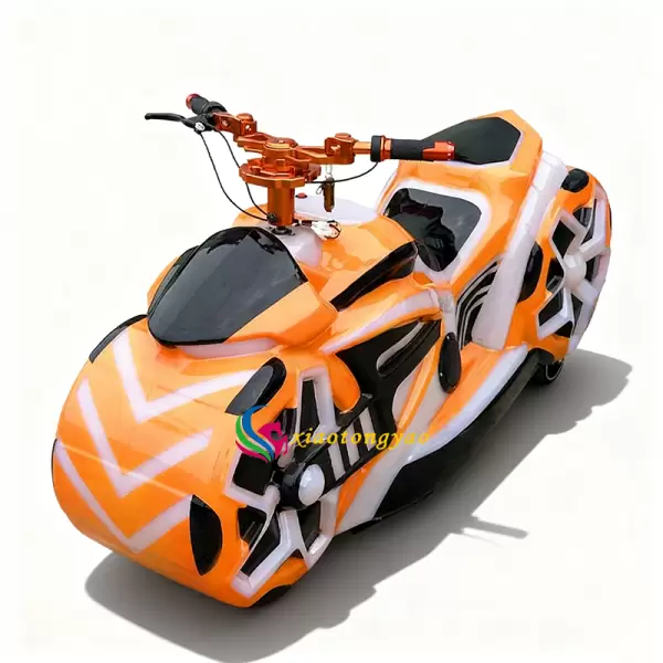 这款发光游乐摩托车,外观设计炫酷吸睛,采用亮眼的橙白配色,搭配独特的车身线条与造型,极具未来感和视觉冲击力。它还具备发光功能,在游乐场景中,能闪烁出绚丽光芒,为游玩增添梦幻氛围。操作方面,设计贴合人体工学,上手容易,无论是孩子还是成人,都能轻松驾驭,尽享骑行乐趣,是户外公园等场所游乐的绝佳选择,能为游客带来别样的欢乐体验。
