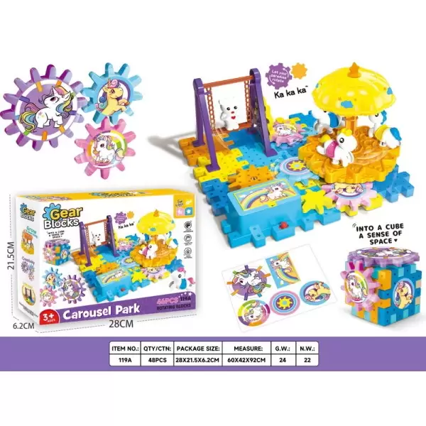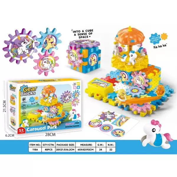 货号118A系列,益智旋转木马乐园会旋转的齿轮联动积木科教益智玩具(电动)46pcs,产品具备:10P,ASTM,EN71,CA65,CD,CE,CPC,CPSC,CPSIA,PAHS,GCC证书,欢迎咨询订货