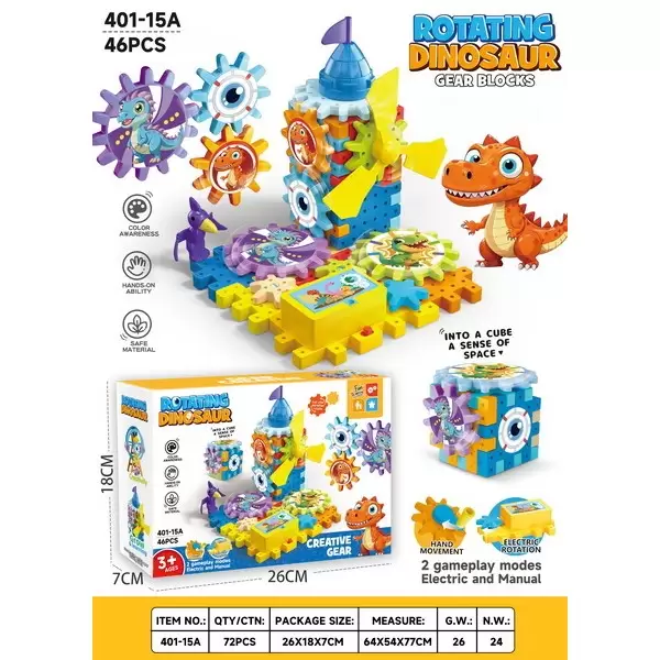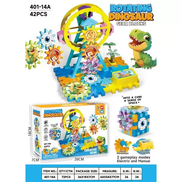 货号401-14A系列,恐龙乐园摩天轮会旋转的齿轮联动积木科教益智玩具(电动)42pcs,产品具备:10P,ASTM,EN71,CA65,CD,CE,CPC,CPSC,CPSIA,PAHS,GCC证书,欢迎咨询订货