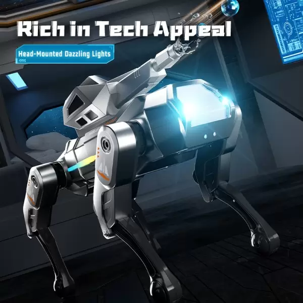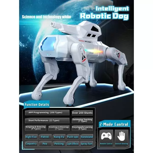遥控功能介绍:具有前进,后退,左转,右转,停止,坐下,趴下,撒娇,编程,问好,倒立,AI,俯卧撑,演示,祝福,游泳,撒尿,发射,灯光,打屁,音量调节,跳舞,歌曲,功夫。