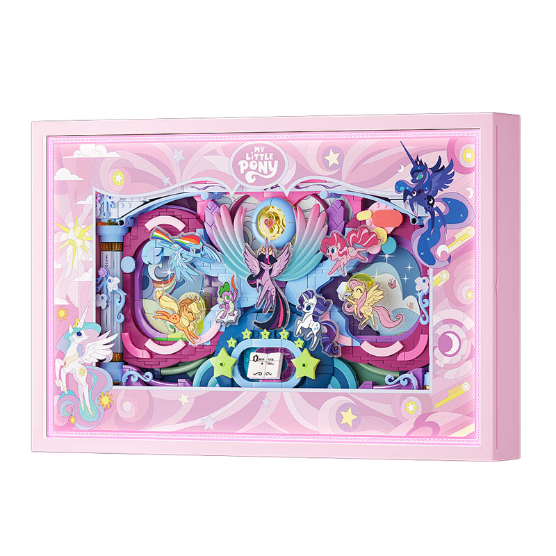 官方正版授权,高度还原小马宝莉j经典名画场景,配有小马宝莉全明星阵容,采用多层立体积木叠构的方式生动还原每位小马的标志性神态与色彩,将小马谷的友谊定格为永恒的艺术珍品,在灯饰大相框的装裱下,“氛围感”得到更好的收藏。
